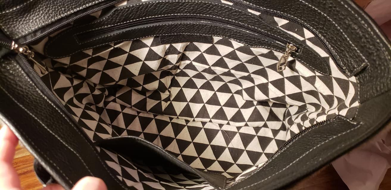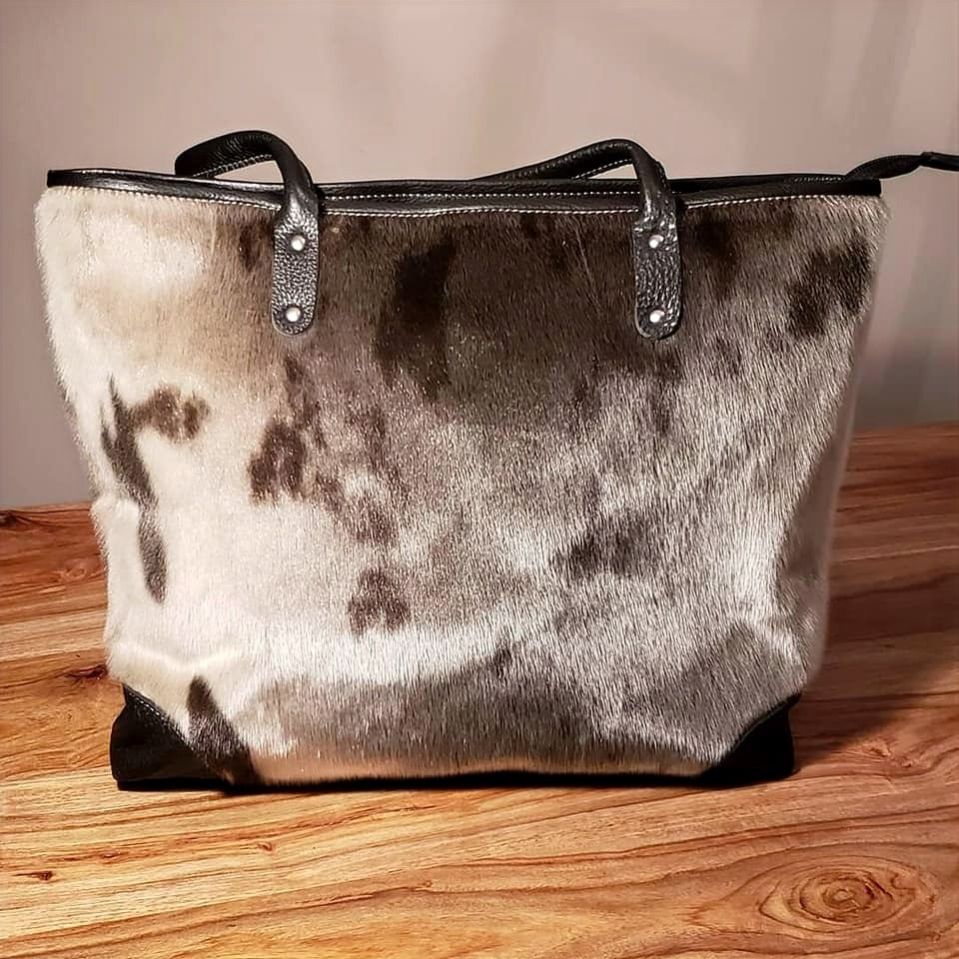 Natural Sealskin tote bag with black leather, zipper closure.